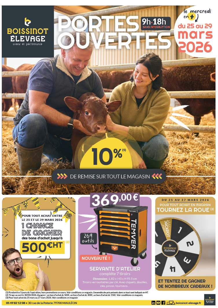 Découvrez nos promotions exclusives et nos offres spéciales en cours sur une large gamme de produits pour faire des économies tout en bénéficiant de la qualité Boissinot Élevage.