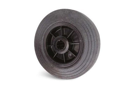 Roue à bandange caoutchouc noir pressé sur jante plastique, roulement silencieux performant et anti-corrosion.